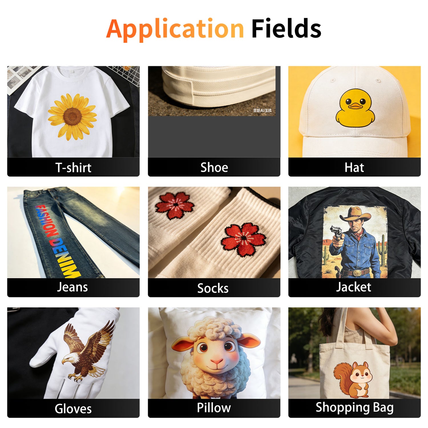 Perfect for printing on T-shirts, hats, bags, pillows, shoes, socks, hoodies, cushions, and other materials.