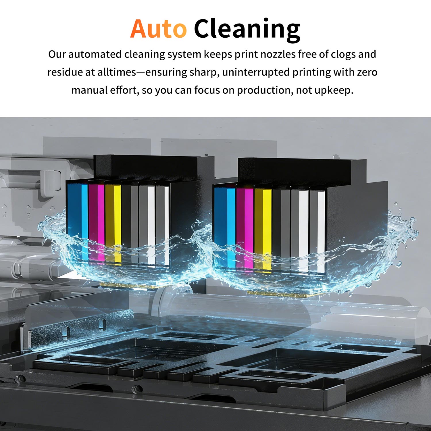 Our automated cleaning system keeps print nozzles free of clogs and residue at alltimes—ensuring sharp, uninterrupted printing with zero manual effort, so you can focus on production, not upkeep.
