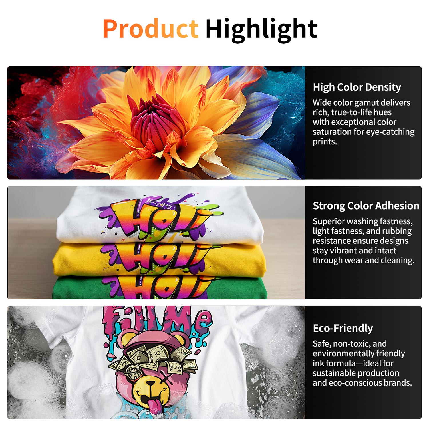 Safe, non-toxic, and environmentally friendly ink formula—ideal for sustainable production and eco-conscious brands.