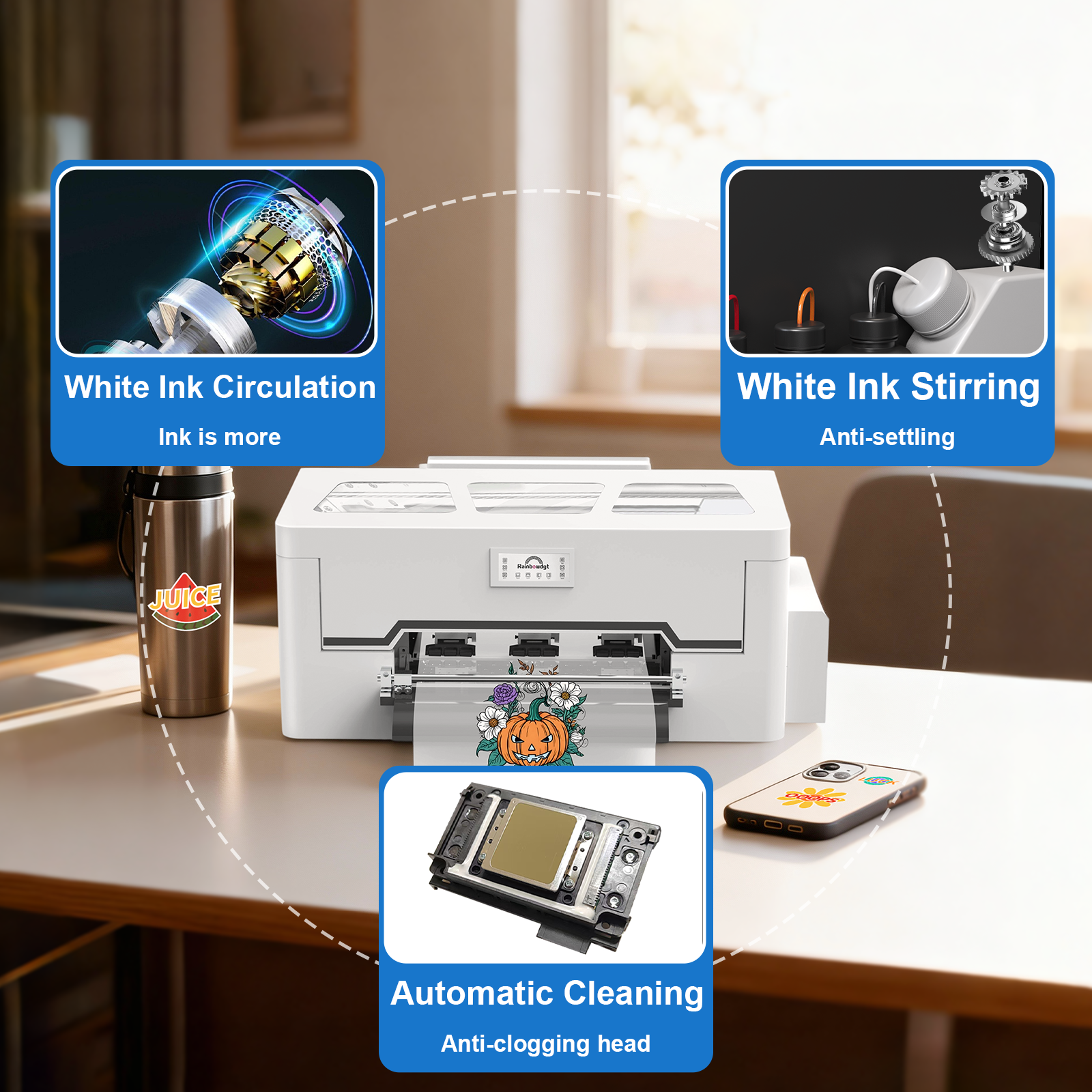 **【Printhead Protection System】** The advanced white ink circulation and auto-cleaning system prevent clogs and ensure smooth printing. The built-in moisturizing device keeps the printhead moist even after long periods of inactivity, making it ideal for high-volume production.