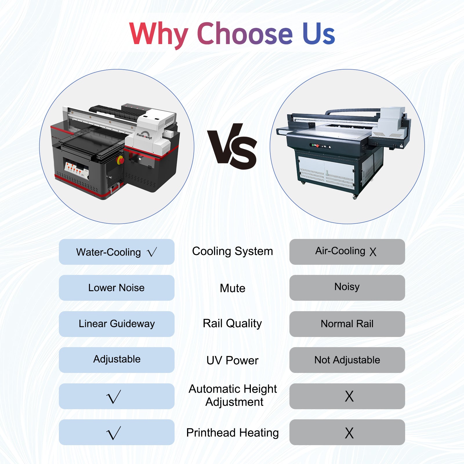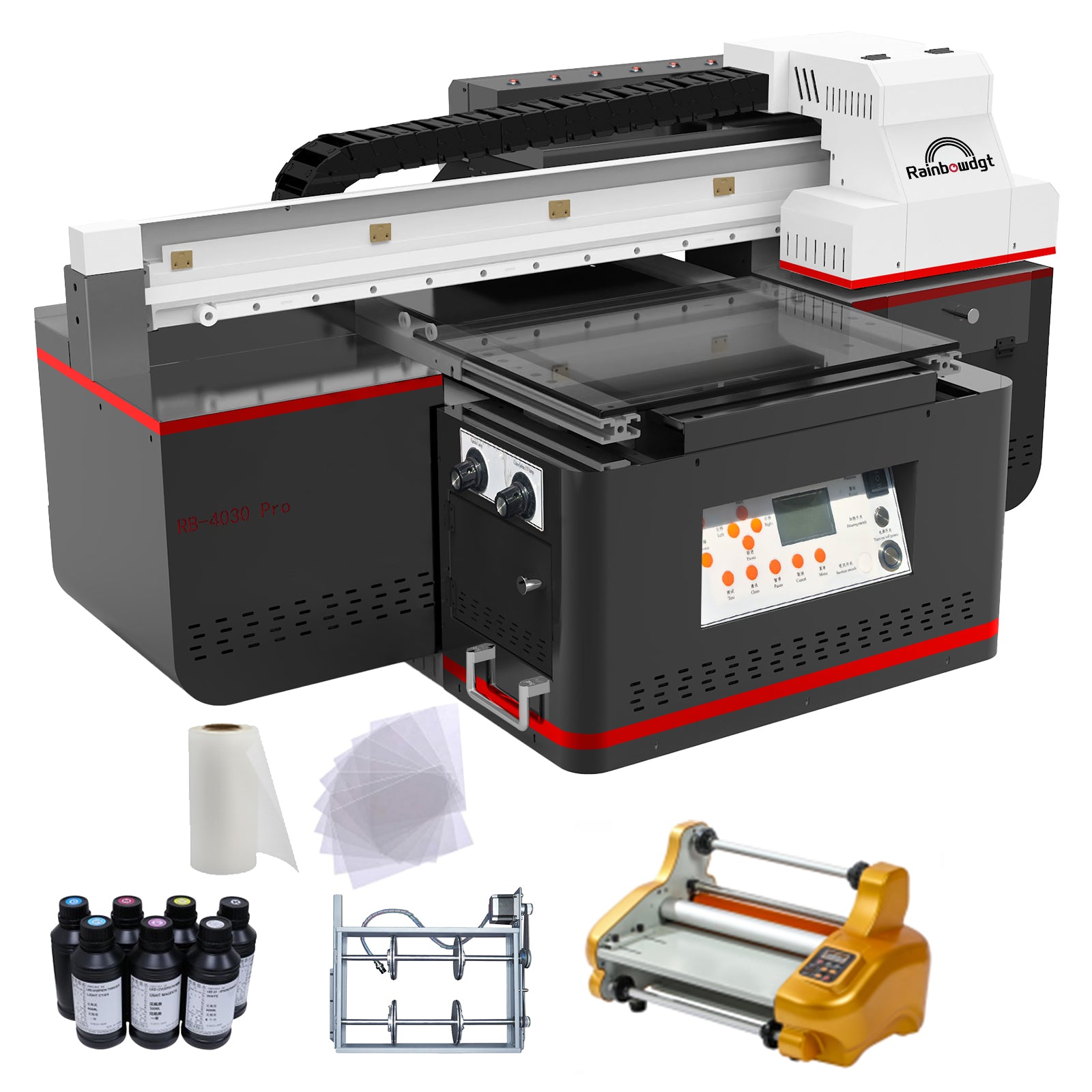 RB-4030 Pro A3 UV flatbed printer has two options of single and double heads, their difference on printing speed and vanish effect. Single head option can print CMYKW while double heads can print CMYKW+Vanish. They both are very competitive on price because they can print on metal, wood, pvc, plastic, glass, crystal, stone and rotary. Rainbow Inkjet UV printer vanish, matte, reverse print, fluorescence, bronzing effect are all supported. Besides, RB-4030 Pro support direct to film print and transfer to materials above, therefore many non-planar substrates print problem is conquered.